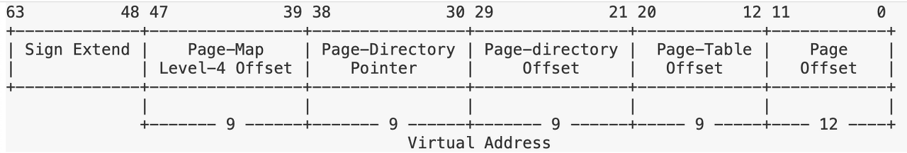 가상 페이지라고도 하는 페이지는 길이가 4,096바이트( 페이지 크기 ) 인 가상 메모리의 연속 영역입니다 . 페이지는 페이지 정렬 되어야 합니다 . 즉, 페이지 크기로 균등하게 나눌 수 있는 가상 주소에서 시작 해야 합니다 . 따라서 64비트 가상 주소의 마지막 12비트는 페이지 오프셋 (또는 오프셋 )입니다. 상위 비트는 곧 도입될 페이지 테이블의 인덱스를 나타내는 데 사용됩니다. 64비트 시스템에서는 가상 주소를 아래 그림처럼 만드는 4레벨 페이지 테이블을 사용합니다.